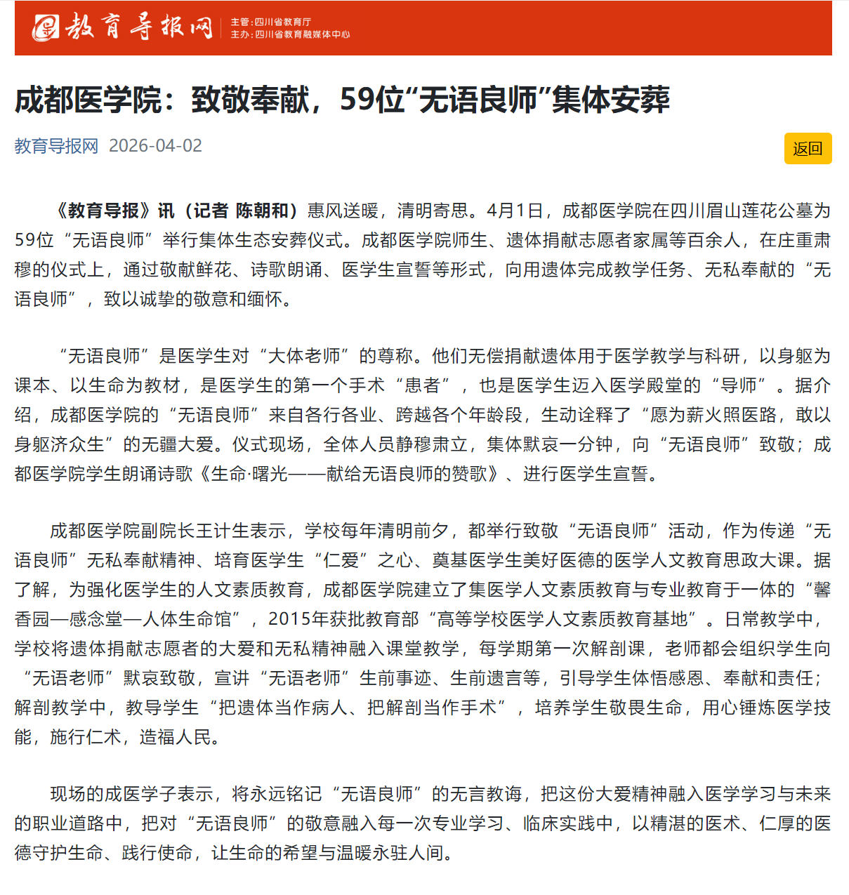 教育导报网:成都医学院:致敬奉献,59位“无语良师”集体安葬