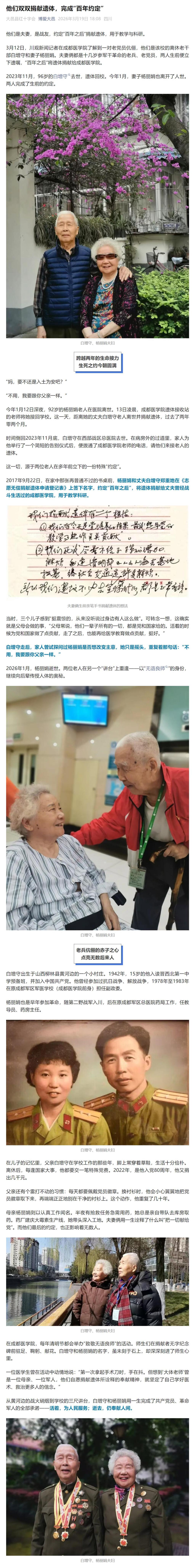 3月12日,川观新闻记者在成都医学院了解到一对老党员伉俪,他们是该校的离休老干部白增守和妻子杨丽娟。夫妻俩都是十几岁参军干革命的老兵、老党员,两人生前便立下遗嘱,“百年之后”将遗体捐献给成都医学院。
